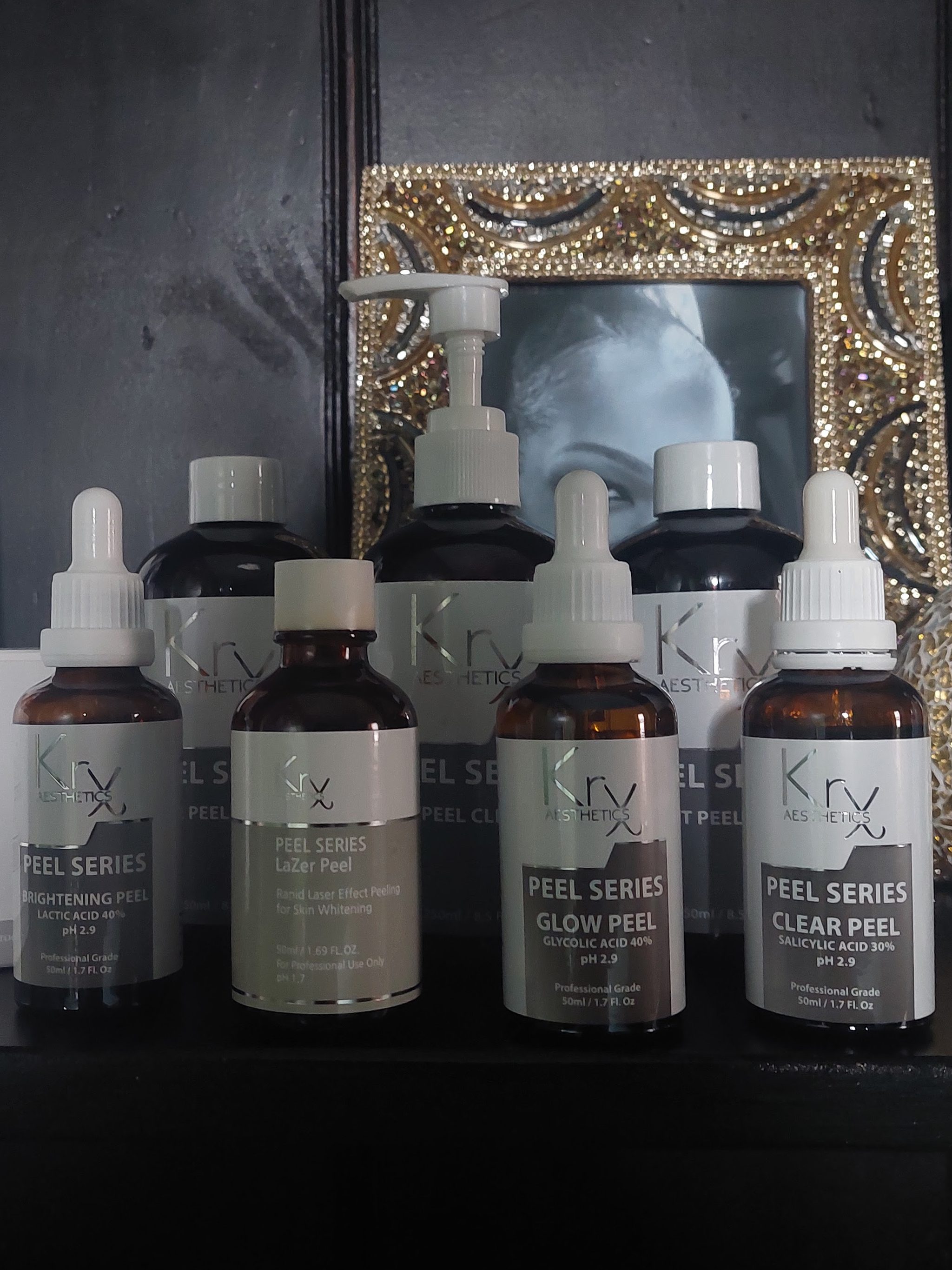 Lazer peel by Krx is a medium depth peel Ph 1.7 that combines multiple acids to deliver a brightening effect similar to a laser treatment. Glycolic, Citric, Cactic, Tranexamic, Salicylic and Hexylresorcinol acids. (No downtime)