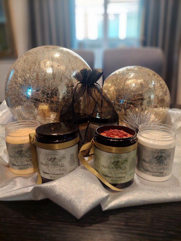 Pamper your skin with Sheila’s luxurious, handmade Shuga Scrubs and Body Crème, crafted with love and care. Each body crème is enriched with organic coconut oil, cocoa butter and vitamin E. While each Shuga Scrub is curated with raw cocoa butter, organic jojoba oil, coconut oil, vitamin E, essential oils and granulated white sugar. SJ Black Gold Beard Oil is a combination of castor oil, jojoba, grape seed, vitamin E and fragrant essential oil. I choose to use 100% raw organic natural ingredient’s, derived directly from nature, free from synthetic chemicals and non-organic preservatives, leaving the skin feeling nourished, healthy, and vibrant. Choose from my signature year-round scents, including: