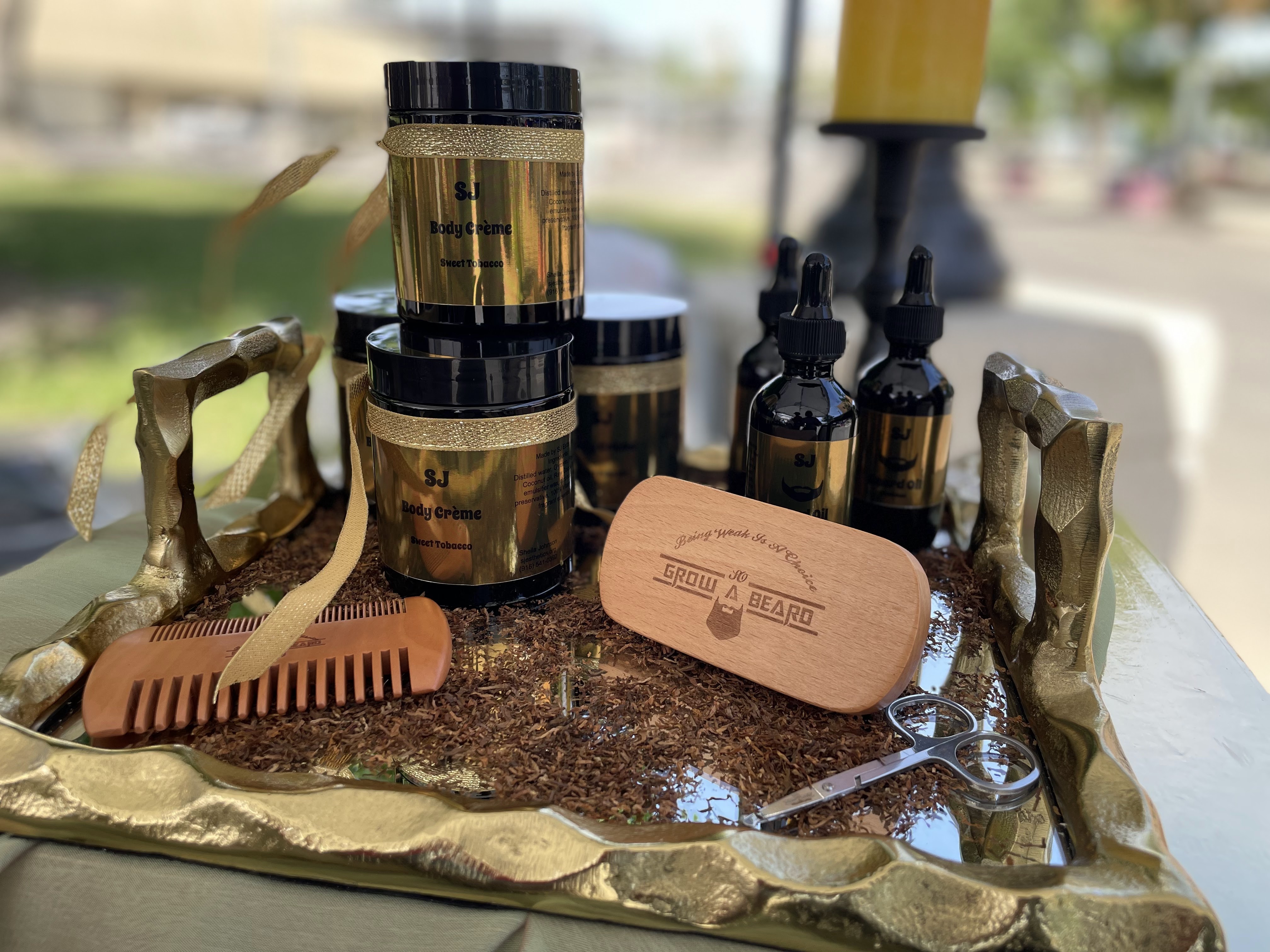 Men’s custom sets are $62 this includes: Body Wash, SJ Black Gold Beard Oil, Body Creme, and Lip Balm! The Body Crème is infused with Sweet Tobacco Oil.